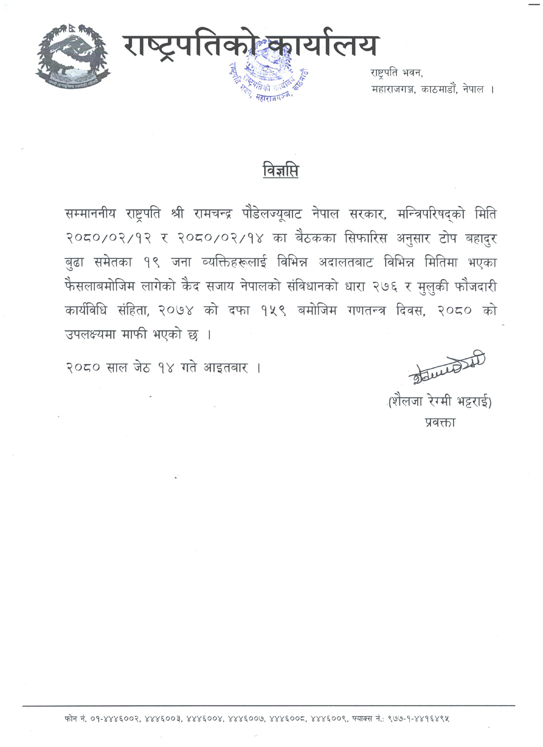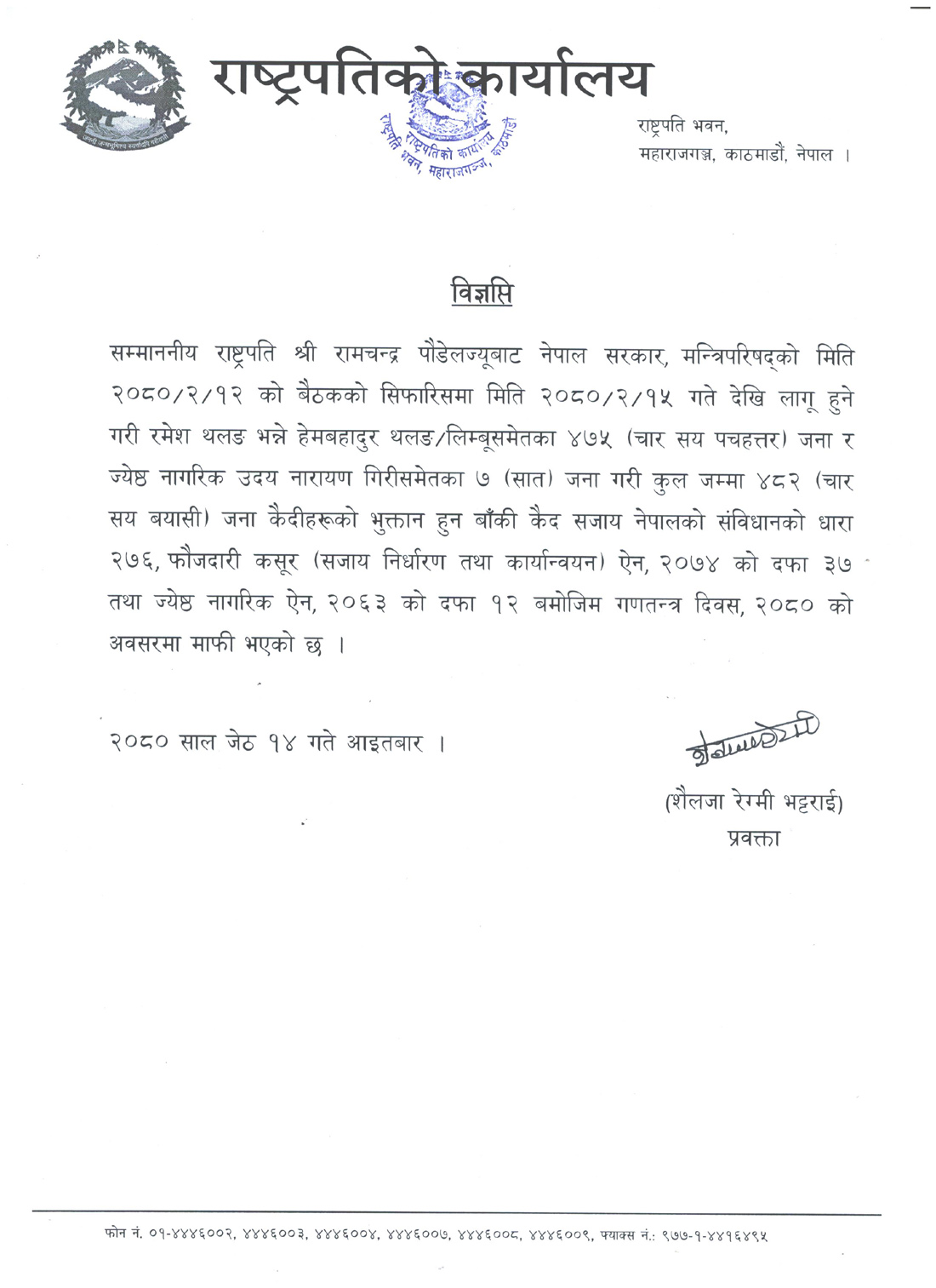 रामचन्द्र पौडेलले मन्त्रिपरिषद्को जेठ १२ र १४ गतेको निर्णयअनुसार उनीहरुको सजाय मिनाहा गरिदिएको बताइएको छ ।