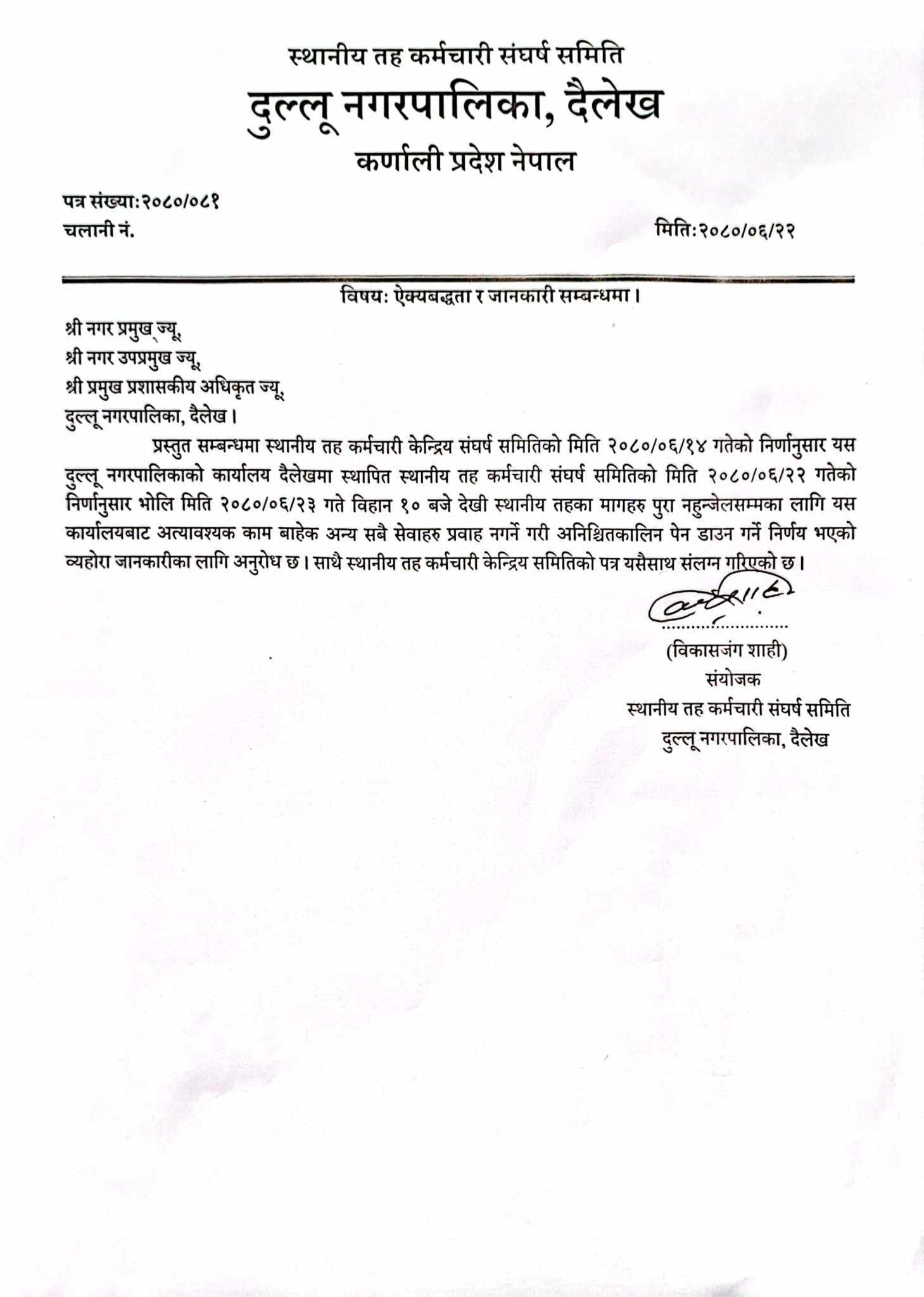स्थानीय तह कर्मचारी संघर्ष समिती दुल्लु नगरपालिका दैलेखले विभिन्न ११ बुदामा मागहरु राख्दै पालिकामा कार्यरत कर्मचारीले पेन डाउन गरेका हुन । जसका कारण कार्यालयबाट प्रवाह हुने नियमित सेवा समेत प्रभावित भइरहेको छ ।