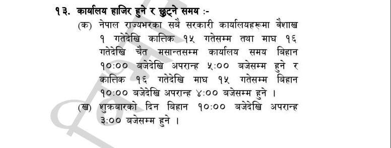 सरकारले राजपत्रमा सूचना प्रकाशित गरेरै तोकेको कार्यालय समय अनुसार वैशाख १ गतेदेखि कात्तिक १५ गतेसम्म तथा माघ १६ देखि चैत मसान्तसम्म कार्यालय समय बिहान १० बजेदेखि अपराह्न ५ बजेसम्म हुने व्यवस्था छ भने कात्तिक १६ गतेदेखि माघ १५ गतेसम्म बिहान १० बजेदेखि अपराह्न ४ बजेसम्म हुने व्यवस्था छ।