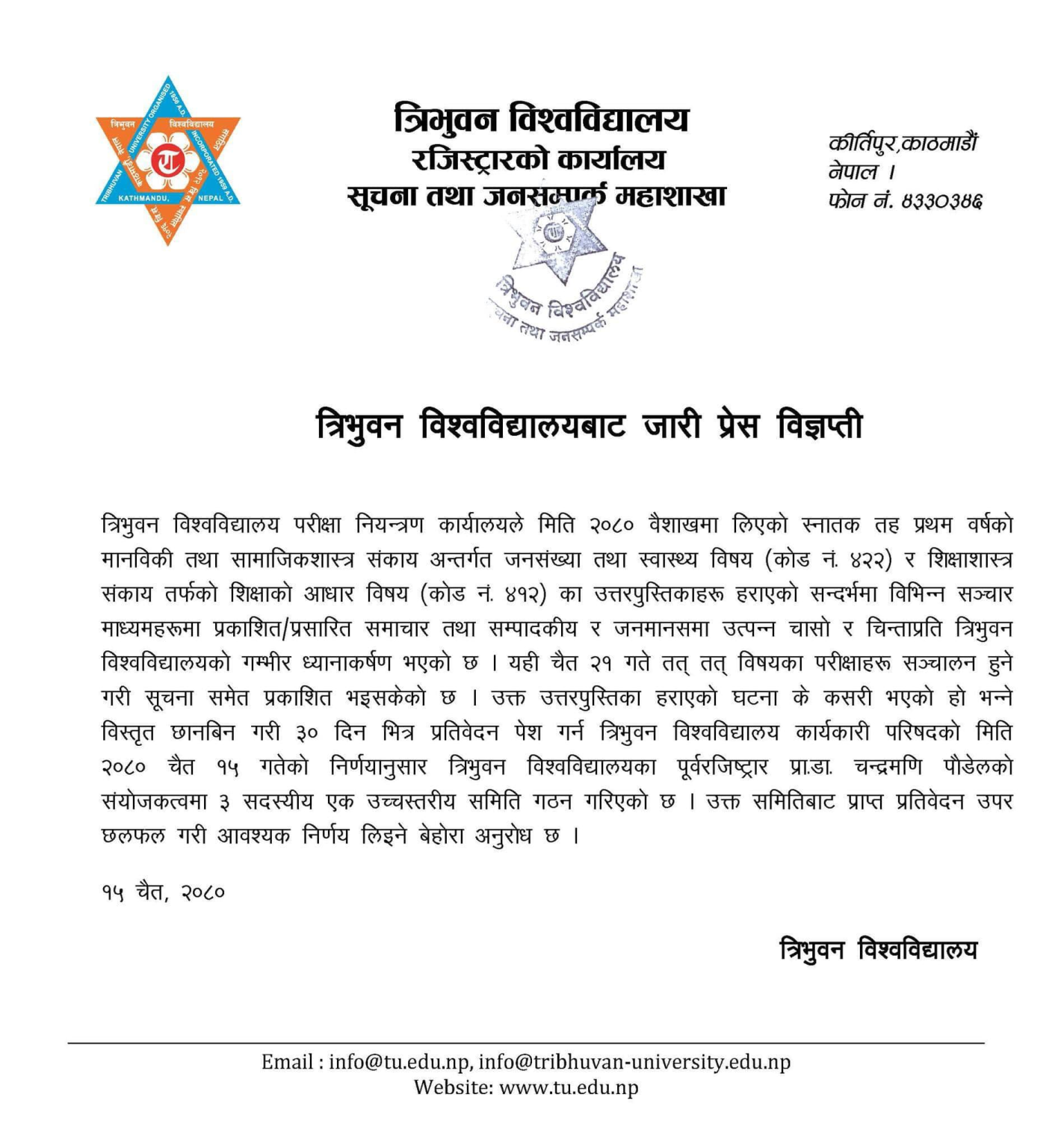 त्रिभुवन विश्वविद्यालय परीक्षा नियन्त्रण कार्यालयले मिति २०८० वैशाखमा लिएको स्नातक तह प्रथम वर्षको मानविकी तथा सामाजिक शास्त्र सङ्काय अन्तर्गत जनसङ्ख्या तथा स्वास्थ्य विषय (कोड न. ४२२) र शिक्षा शास्त्र सङ्काय तर्फको शिक्षाको आधार विषय (कोड न. ४१२) का उत्तर पुस्तिकाहरू हराएको थियो ।
