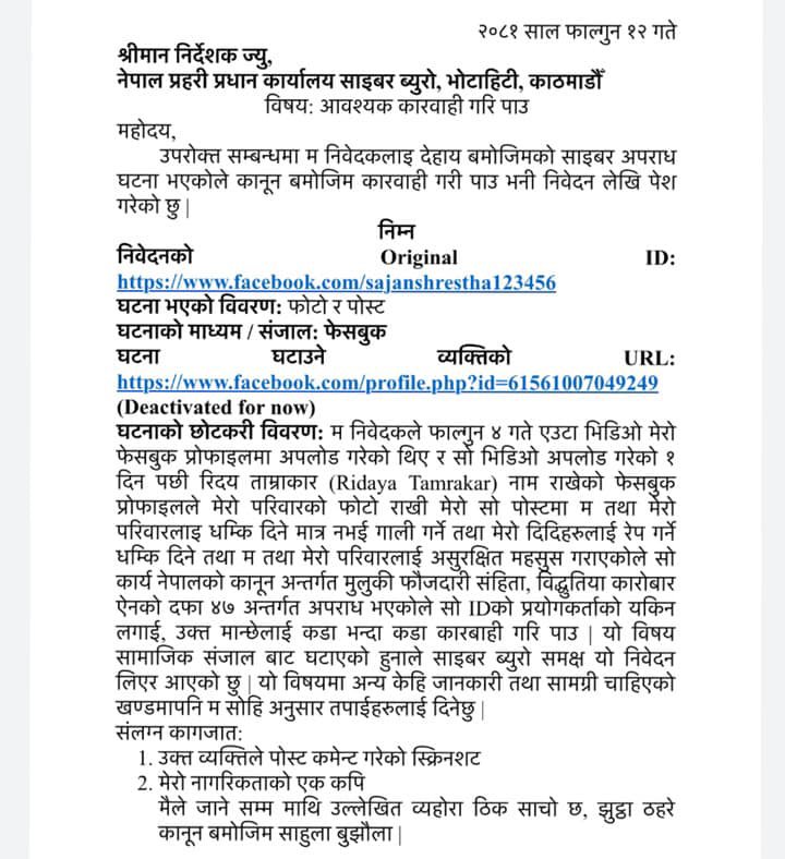 काठमाडौं । कमेडियन सजन श्रेष्ठले आफू र आफ्नो परिवार असुरक्षित रहेको भन्दै प्रहरीको साइबर ब्युरोमा उजुरी दर्ता गरेका छन् । आइतबार सामाजिक सञ्जालमार्फत जानकारी दिँदै उनले आफूलाई रिदय ताम्राकार नामक फेसबुक ह्याण्डलबाट गम्भीर धम्की प्राप्त भएको खुलासा गरेका हुन् ।