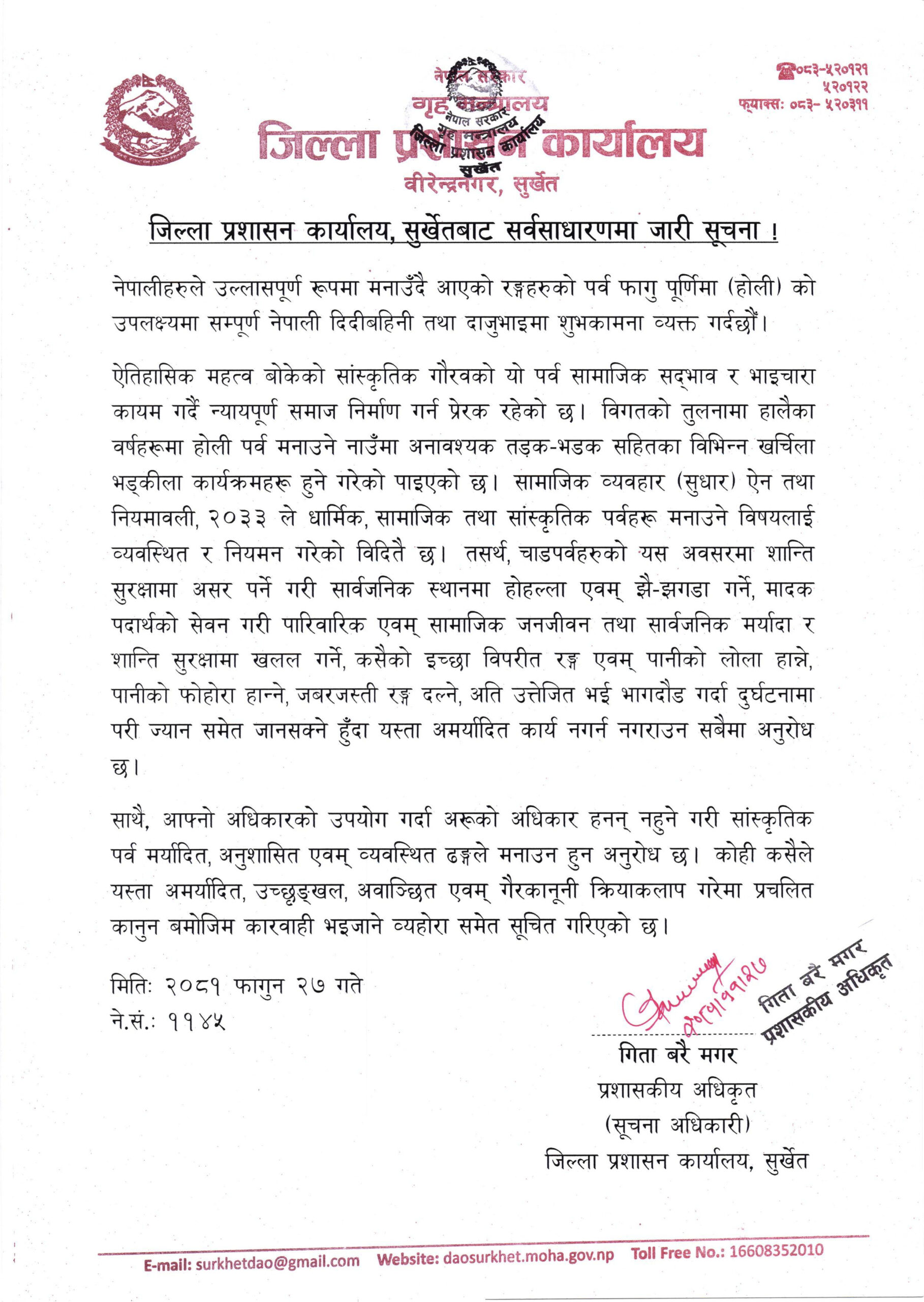‘साथै, आफ्नो अधिकारको उपयोग गर्दा अरूको अधिकार हनन नहुने गरी सांस्कृतिक पर्व मर्यादित, अनुशासित एवम् व्यवस्थित ढङ्गले मनाउन हुन अनुरोध छ । कोही कसैले यस्ता अमर्यादित, उच्छृल, अवाञ्छित एवम् गैरकानूनी क्रियाकलाप गरेमा प्रचलित कानुन बमोजिम कारवाही हुनेछ ।’