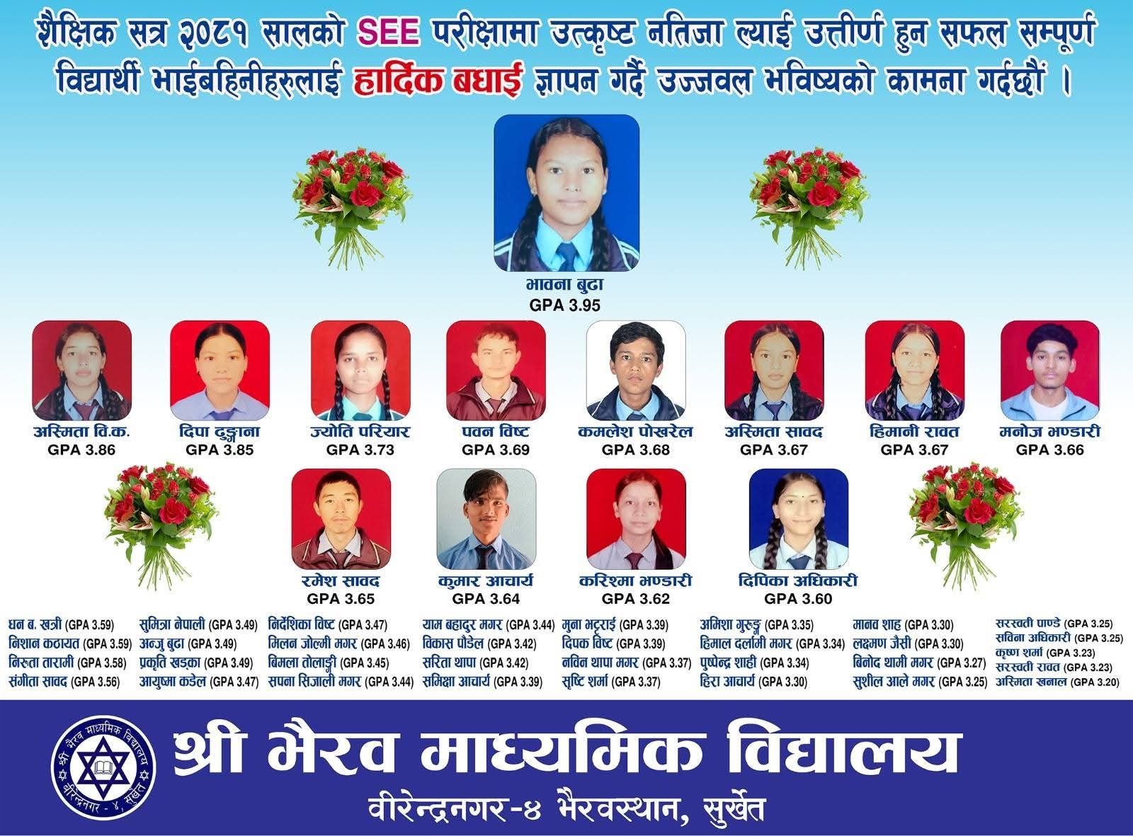 सुर्खेत । वीरेन्द्रनगर नगरपालिका–४ मा रहेको भैरव माध्यमिक विद्यालयले २०८१ सालको माध्यमिक शिक्षा परीक्षा (एसईई) मा ९१ प्रतिशत विद्यार्थीलाई उतिर्ण गर्दै उल्लेखनीय सफलता हात पारेको छ।