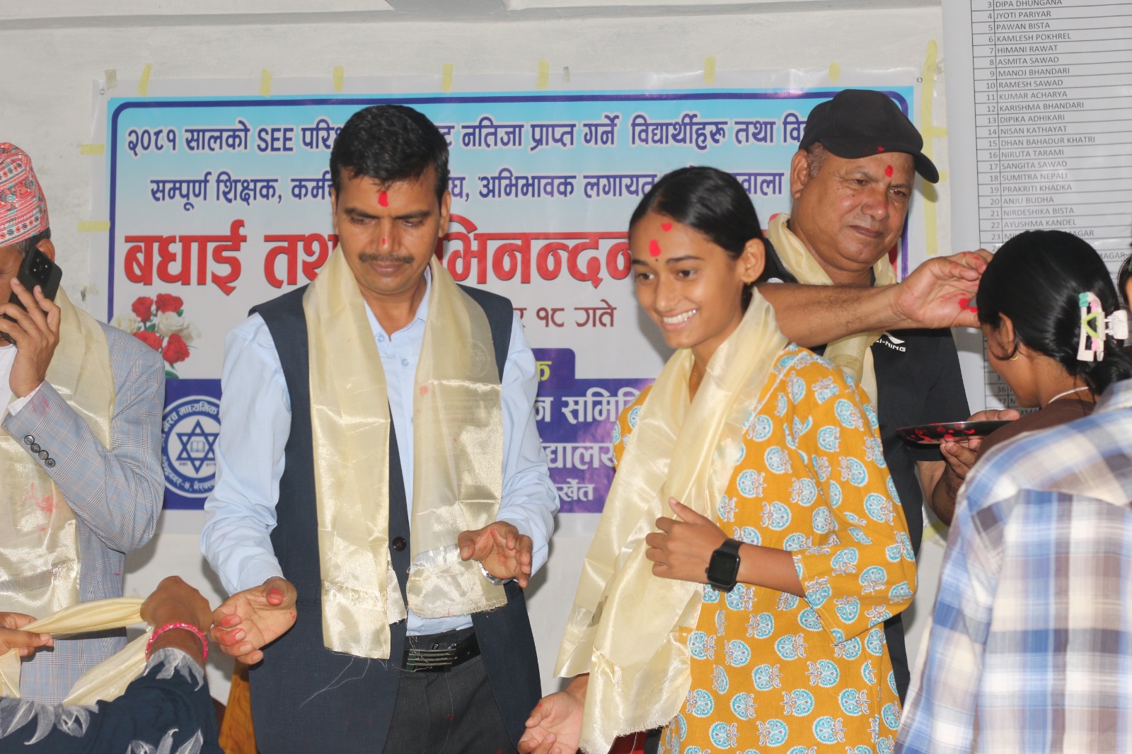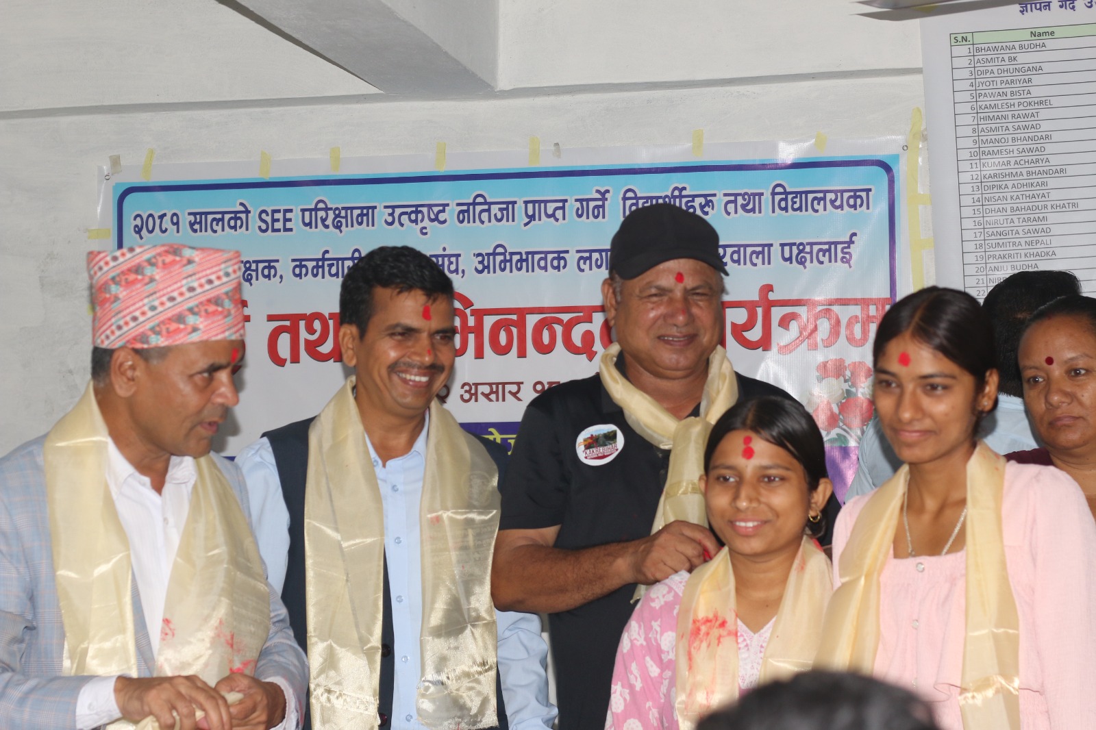 यसै उपलक्ष्यमा विद्यालयले बुधबार एक कार्यक्रम आयोजना गरी शिक्षक, अभिभावक तथा सरोकारवालाको उपस्थितिमा विद्यार्थीहरुलाई बधाई तथा अभिनन्दन गर्दै सम्मान गरेको छ।