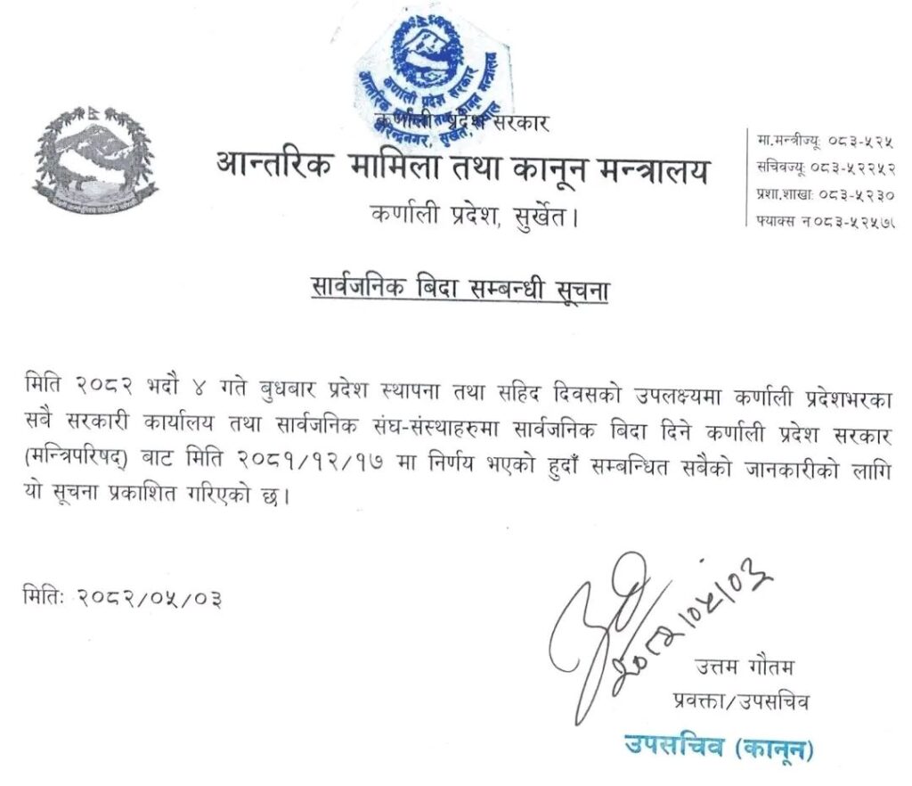 विसं २०८१ चैत १७ गते बसेको प्रदेश सरकार मन्त्रिपरिषद् बैठकले भदौ ४ गते कर्णाली प्रदेशका सरकारी तथा सार्वजनिक सङ्घ संस्था सबैमा सार्वजनिक बिदा दिने निर्णय गरेको आन्तरिक मामिला तथा कानून मन्त्रालयका प्रवक्ता उत्तम गौतमले जानकारी दिनुभयो ।