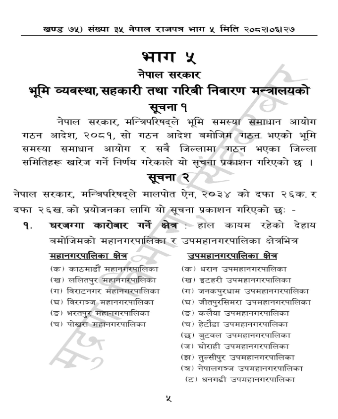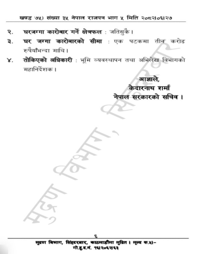 काठमाडौं । सरकारले घरजग्गा कारोबारलाई थप व्यवस्थित र पारदर्शी बनाउने उद्देश्यले नयाँ मापदण्ड जारी गरेको छ । अब तीन करोड रुपैयाँभन्दा बढी मूल्यका जग्गा कारोबार गर्दा इजाजतपत्र प्राप्त संस्था (ब्रोकर) लाई अनिवार्य रूपमा संलग्न गराउनुपर्ने भएको छ । यो व्यवस्था नेपाल राजपत्रमा सूचना प्रकाशित भएसँगै लागू भएको हो ।