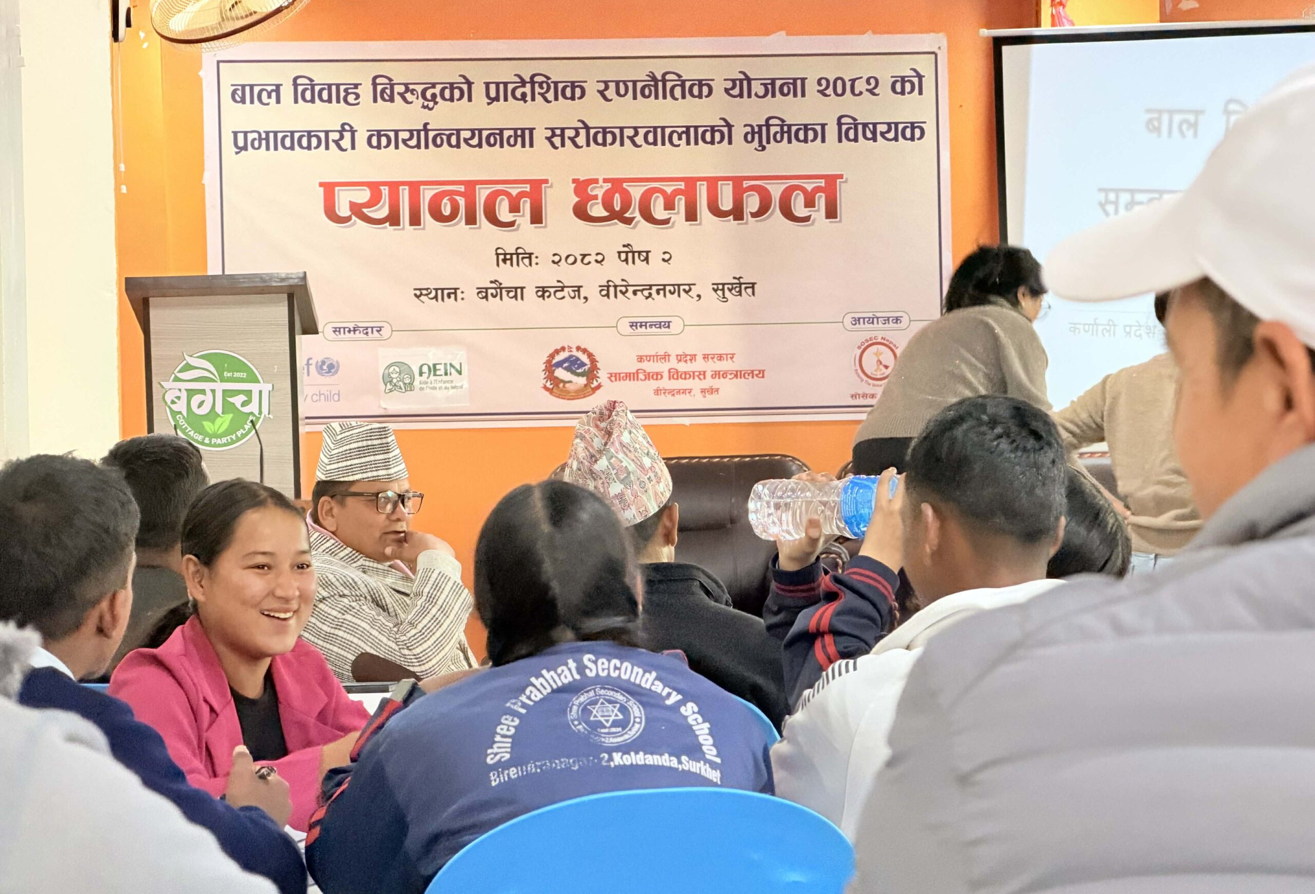 कार्यक्रममा आयोजित प्यानल छलफलमा आर्थिक मामिला तथा योजना मन्त्रालयका मन्त्री राजीब विक्रम शाह, सामाजिक विकास मन्त्री घनश्याम भण्डारी, प्रदेश प्रहरी कार्यालयका प्रहरी नायब महानिरीक्षक माधव प्रसाद श्रेष्ठ, बालविवाह विरुद्धको साझा अभियान सञ्जाल कर्णाली प्रदेशकी अध्यक्ष पवित्रा शाही र अधिवक्ता गीता कोइरालाले बालविवाह विरुद्धको प्रादेशिक रणनीतिक योजनालाई कसरी प्रभावकारी बनाउने भन्ने विषयमा आ–आफ्नो धारणा प्रस्तुत गर्नुभएको थियो।