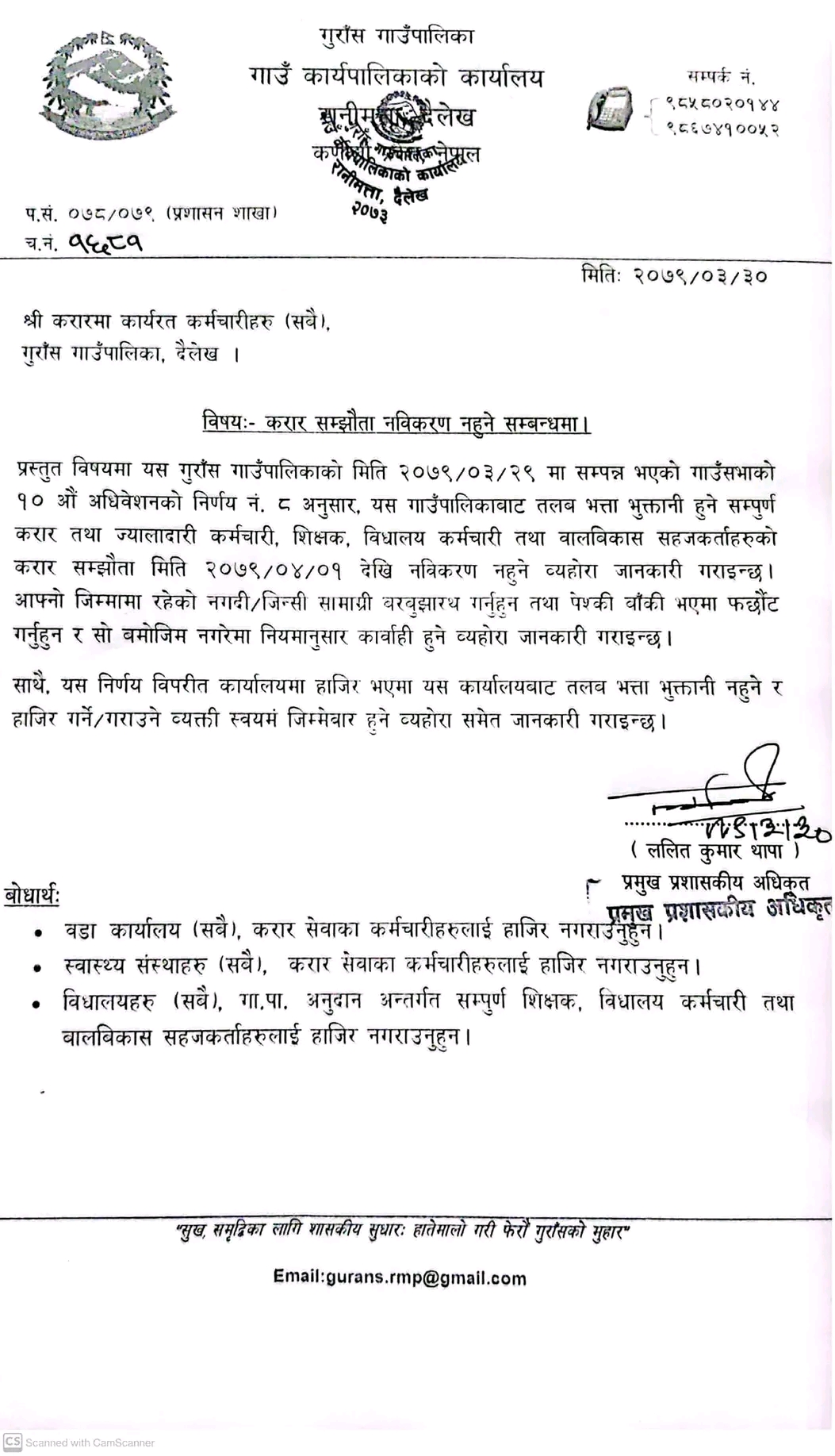 ३० असार, दैलेख । दैलेखको गुराँस गाउँपालिकाले करार कर्मचारीको म्याद थप नगर्ने निर्णय गरेको छ ।