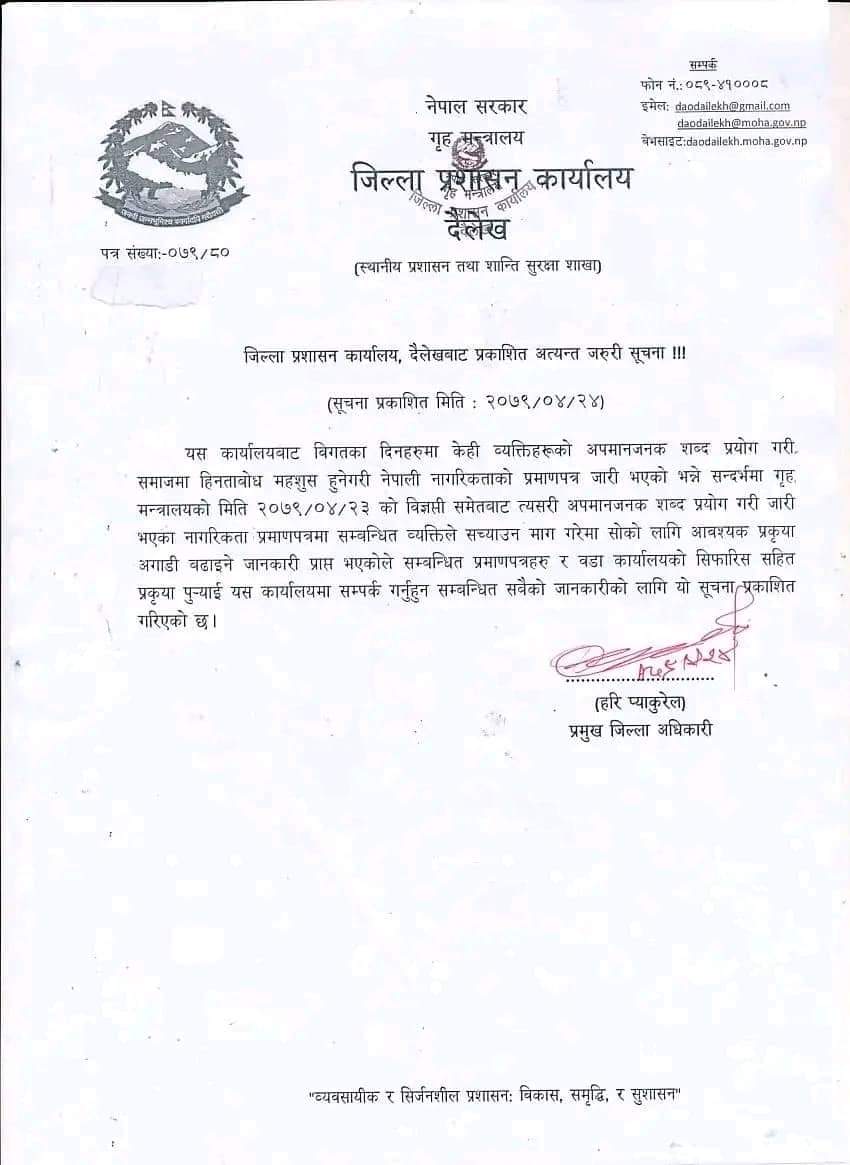 २४ साउन, दैलेख । जिल्ला प्रशासन कार्यालय दैलेखले अपमानजनक नाम राखी जारी भएका नागरिकता सच्याउने भएको छ ।