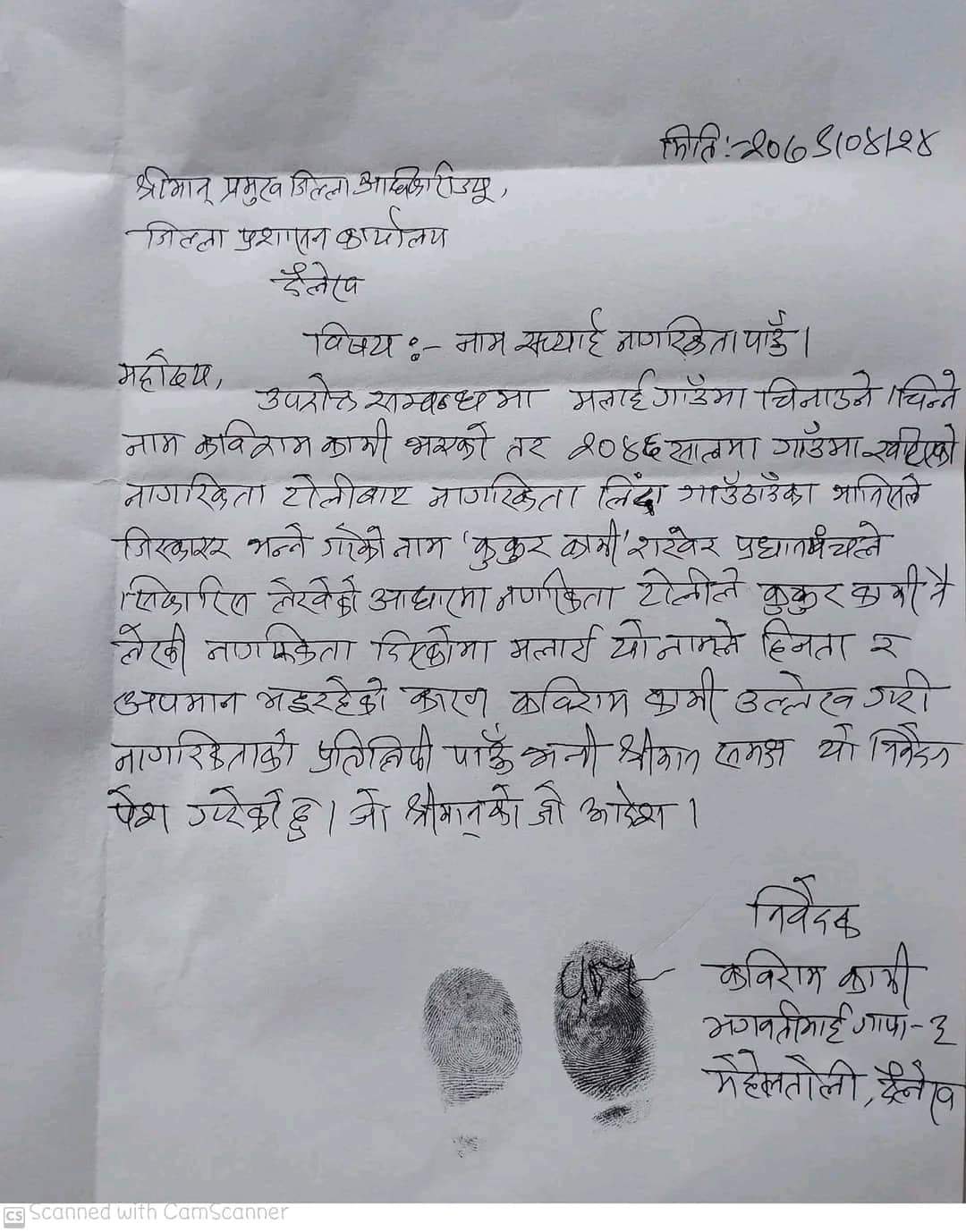 नागरिकतामा ‘कुकूर कामी’ नाम भएका भगवतीमाई गाउँपालिका-३ मेहेलतोलीका कविराम कामीले नागरिकता प्रमाणपत्रको नाम सच्चाउन माग गर्दै जिल्ला प्रशासन कार्यालय दैलेखमा आज निवेदन दिएका थिए ।प्रमुख जिल्ला अधिकारी हरि प्याकुरेलले आवश्यक प्रक्रिया पुर्याएर उहाँ लगायत नागरिकतामा अपमानजनक नाम भएकालाई नयाँ नागरिकता प्रदान गर्ने बताए ।