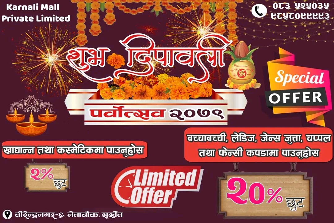 सुर्खेत । सुर्खेतको वीरेन्द्रनगरमा रहेको कर्णाली मल प्रा.लिले नेपालीहरुको महान चाड दिपावलीलाई लक्षित गरेर आफ्ना ग्राहकहरुलाई ‘दिपावली महाअफर’ सार्वजनिक गरेको छ।