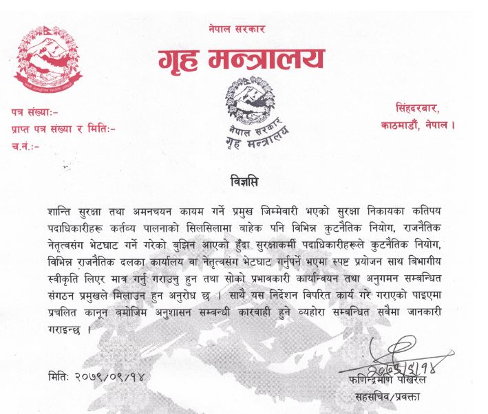 गृह मन्त्रालयले सुरक्षा निकायका कर्मचारी तथा पदाधिकारीहरूलाई नियमित कामको सिलसिलामाबाहेक अन्य समयमा नेता र कूटनीतिज्ञहरूसँग भेट्न प्रतिबन्ध लगाएको छ।