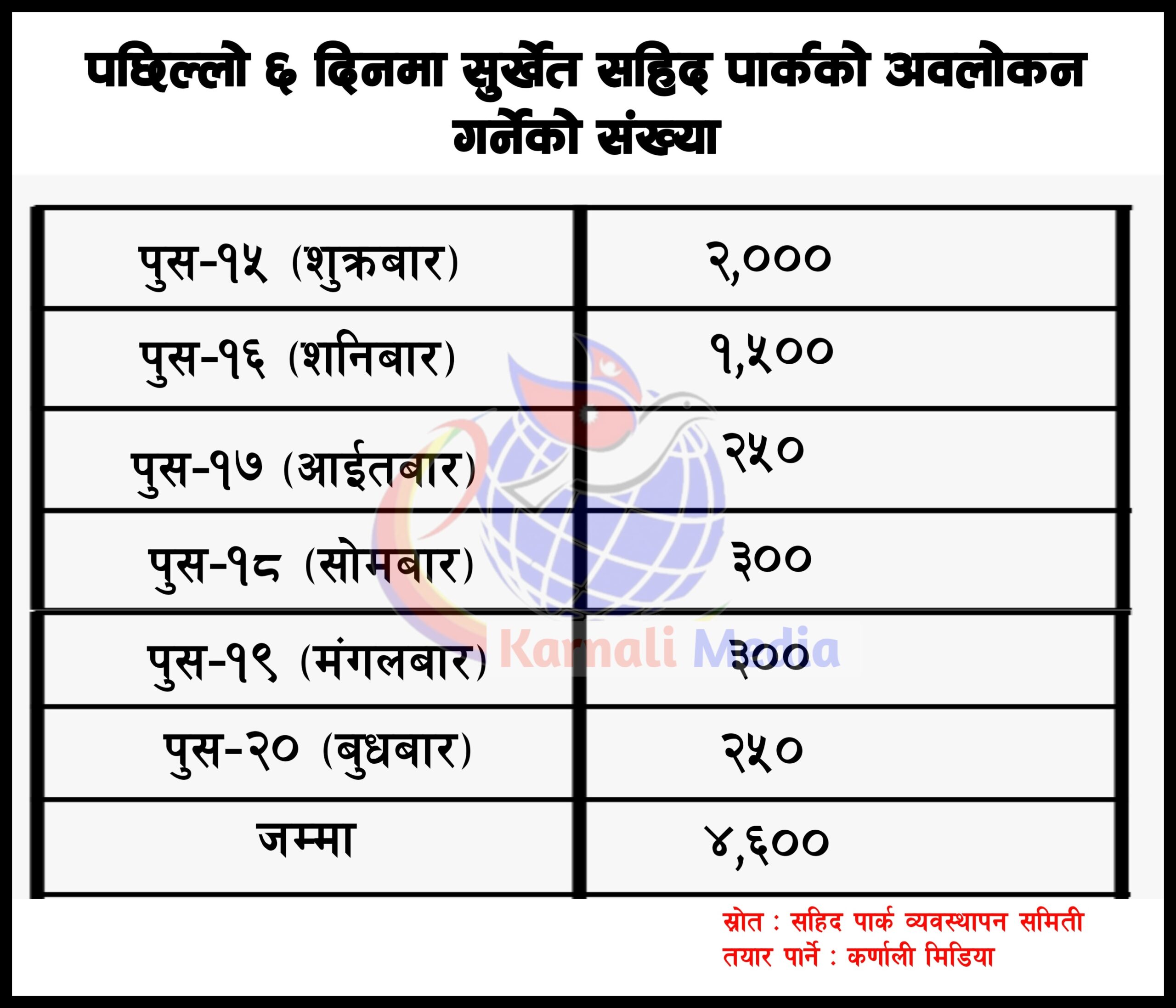 सहिद पार्कमा पुस १५ गते शुक्रबारका दिन मात्र २ हजार पर्यटक सहिद पार्क पुगेका थिए। यस्तै, १६ गते शनिबार १ हजार ५ सयले अवलोकन गरे । पुस १५ र शनिबार भएको कारण उक्त दिन पार्क क्षेत्र भरिभराउ भएको पार्कमा टिकट काट्दै आएका गुरु प्रसाद चालिसेले जानकारी दिए । उनका अनुसार आईतबार करिब २ सय ५०, सोमबार करिब ३ सय, मंगलबार करिब ३ सय र बुधबार करिब २ सय ५० जनाले पार्कमा टिकट काटेर अवलोकन गरेको बताए । यसरी हेर्दा पछिल्लो छ दिनमा करिब ४ हजार ६ सय जनाले सहिद पार्कको भ्रमण गरेका छन् ।
