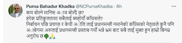 नेता खड्काले लेखेका छन्, “कम बोल्ने मानिस आज बोल्दैछ ? हरेक प्रतिकुलतामा सबैलाई व्यहोरेको छ कांग्रेसले । निर्वाचनपछि प्रचण्ड र केपी ओलीलाई प्रधानमन्त्री नमानेको कांग्रेस नेतृत्वले कुनै पनि आवेगमा अरुलाई प्रधानमन्त्री प्रस्ताव गर्यो भन्ने भ्रमबाट सबैलाई मुक्त हुन हाम्रो विनम्र अनुरोध छ ।”