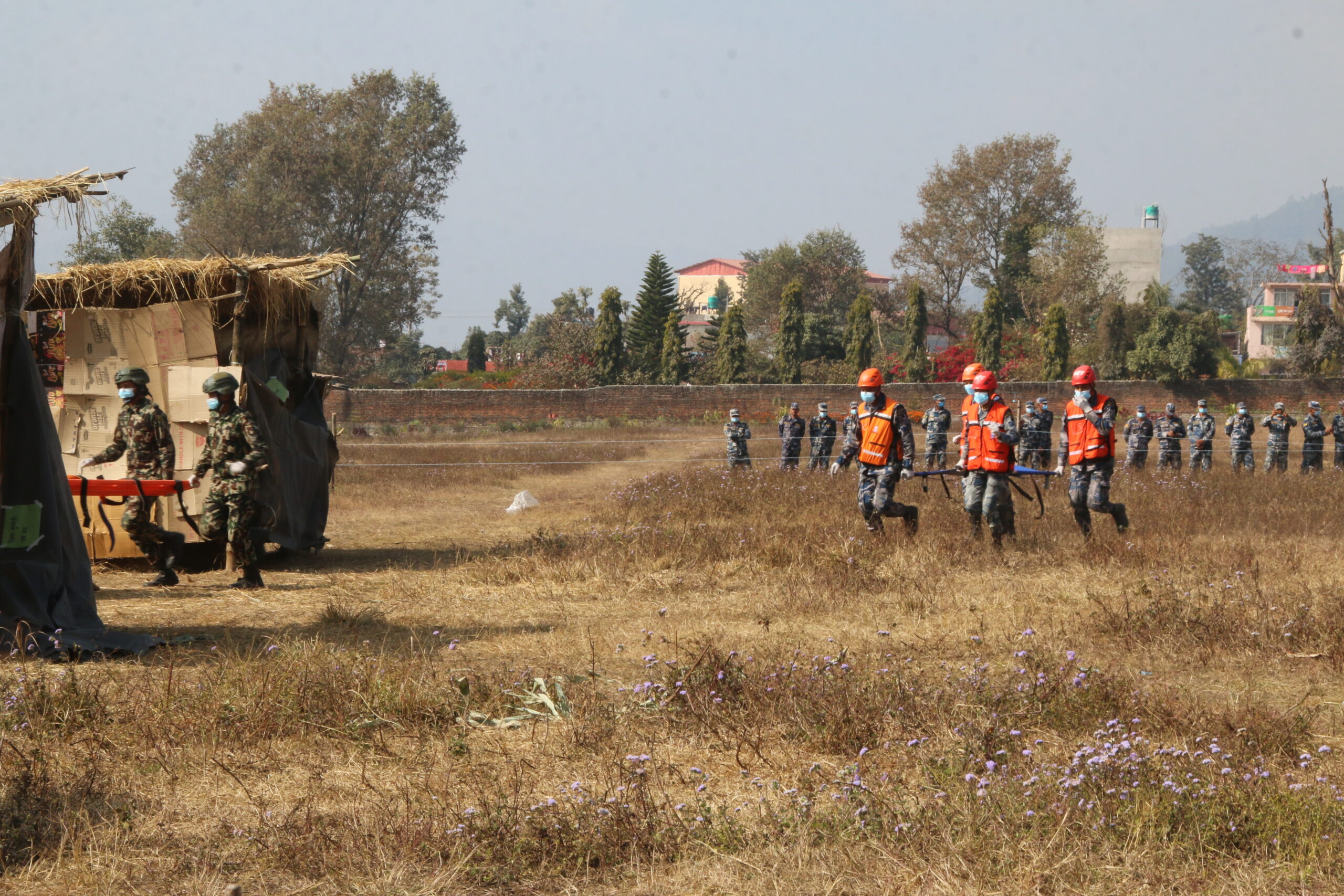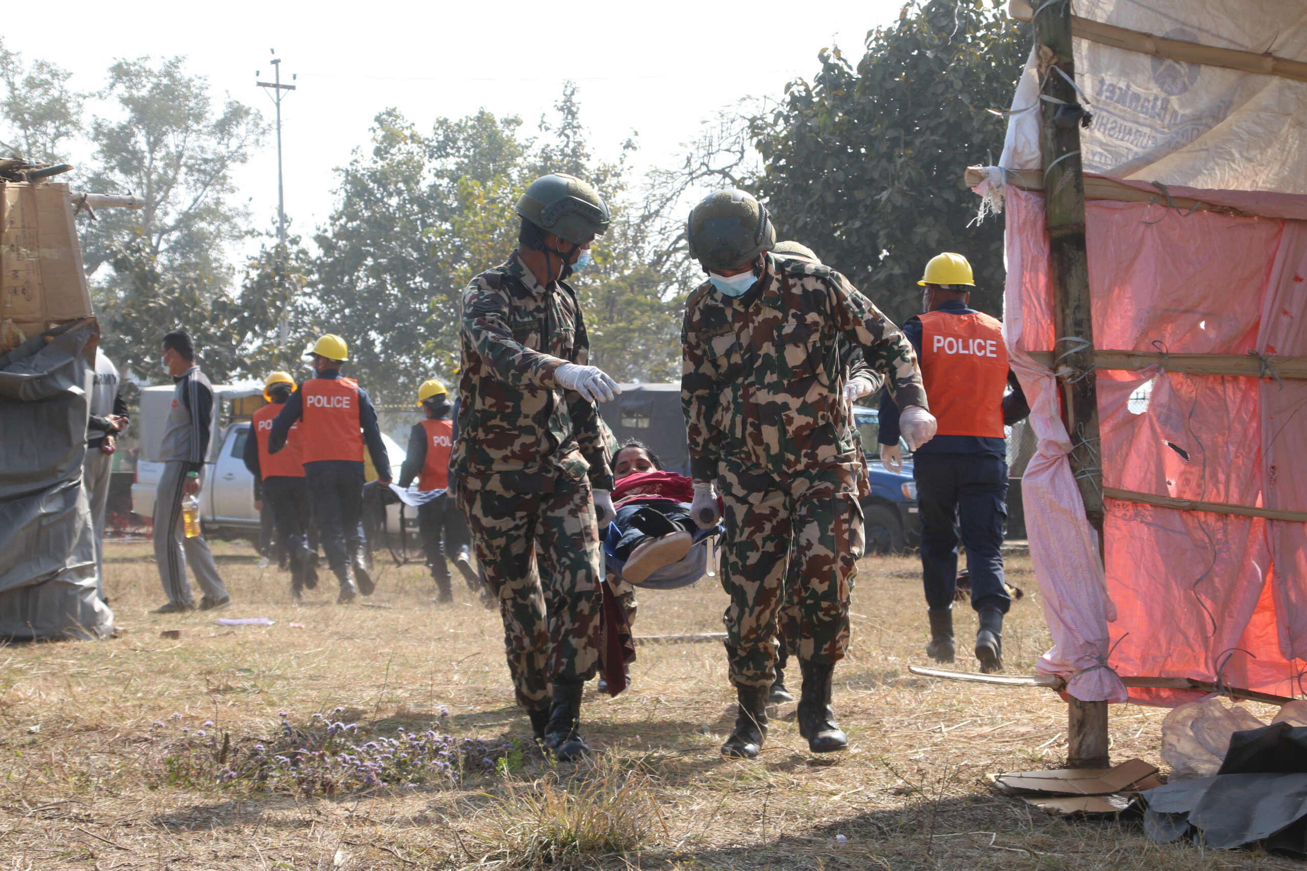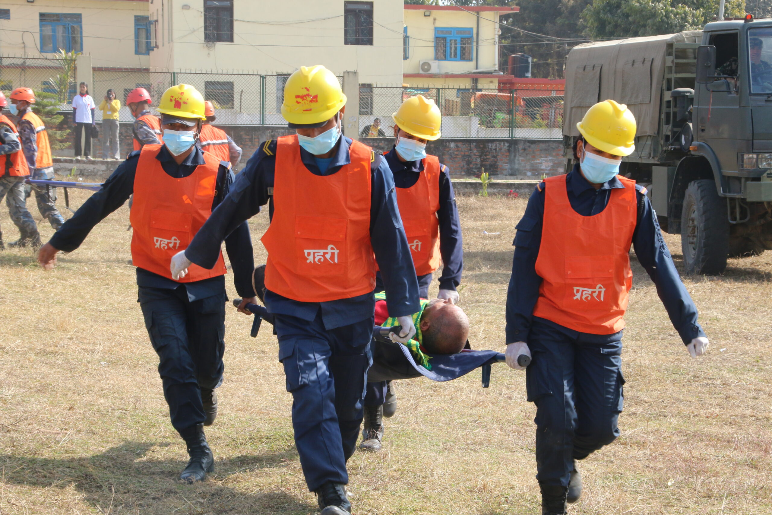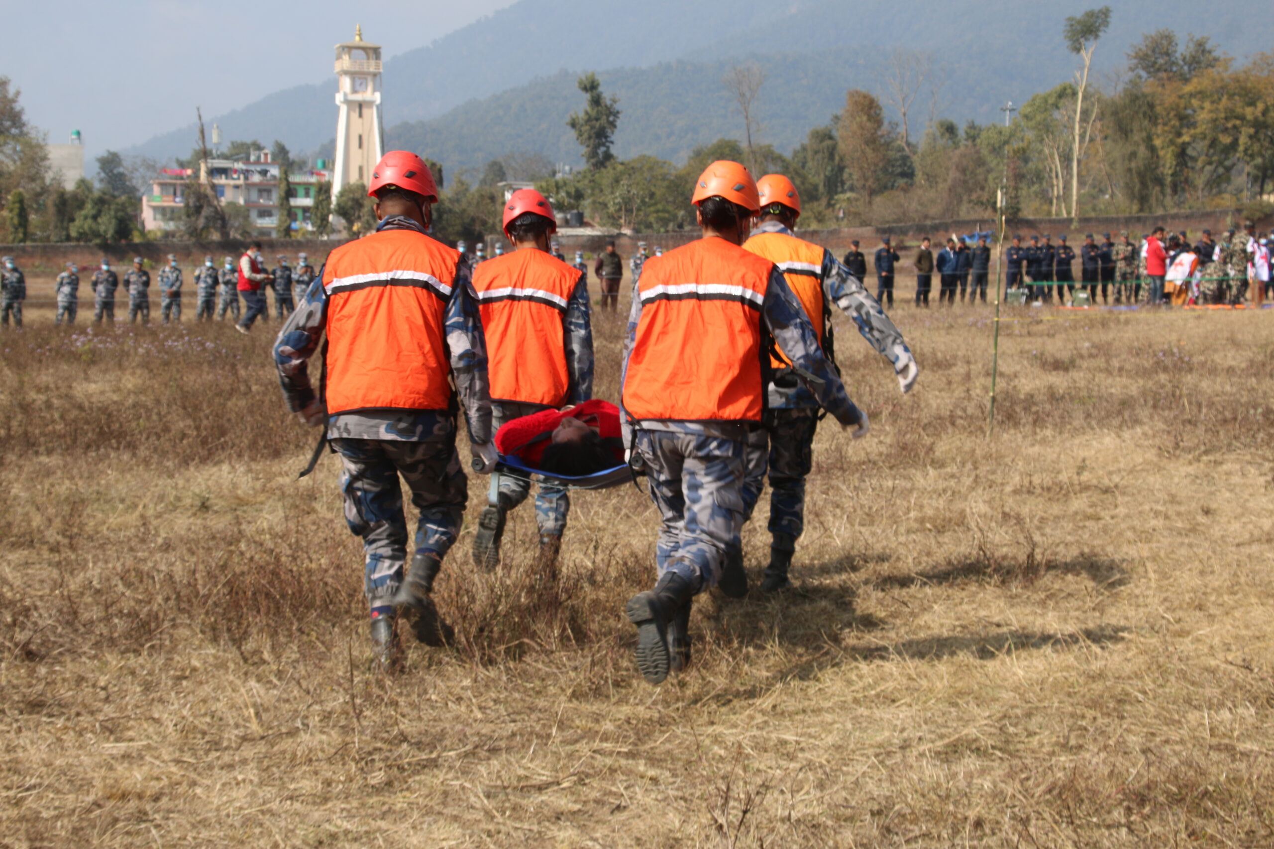 - तस्बिर : घटना अभ्यासमा घाइतेहरुलाई उद्धार गरी प्राथमिक उपचार गर्न लैजादै